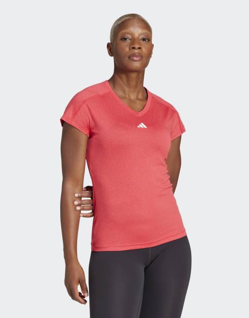 adidas performance Aeroready train essentials minimal branding v-neck tee in pure ruby / white