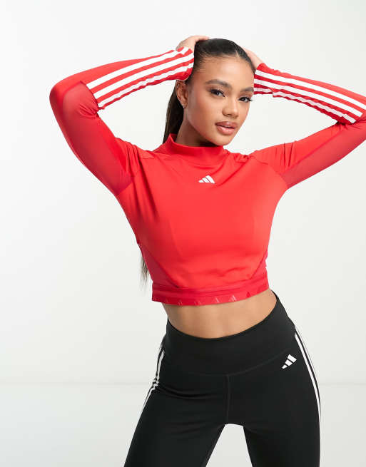 adidas Training Hyperglam 3 stripe long sleeve crop top in red