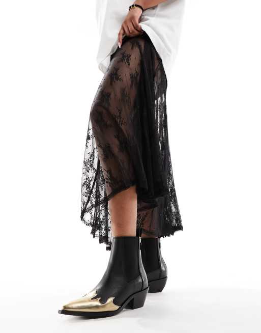 AllSaints Dellaware leather ankle boots in black with gold flame toe