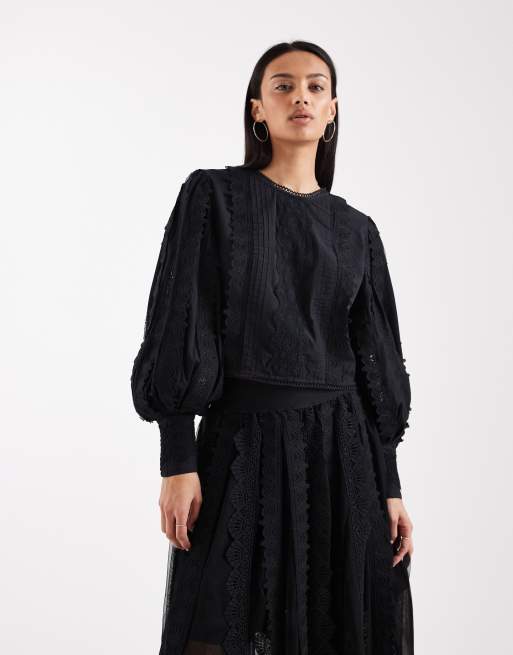 AllSaints Hart embroidered detail long sleeve cropped blouse in black (Part of a set)