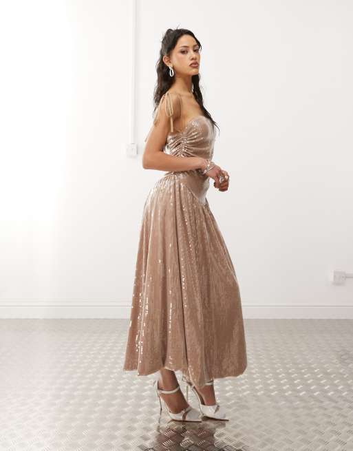Amy Lynn Alexa puffball sequin midi dress in light brown
