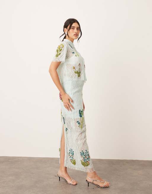 ARRANGE botanical floral embellished lace crop shirt and midi skirt in light blue