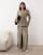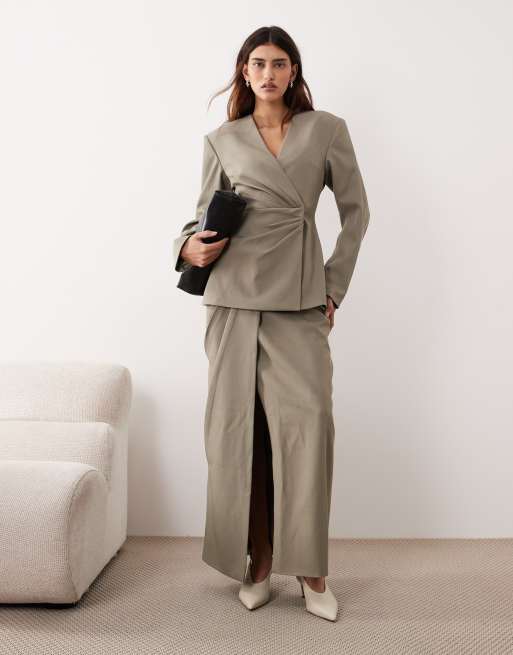 ARRANGE cinched collarless pleated wrap blazer, draped tailored wide leg pants & maxi skirt set in grey