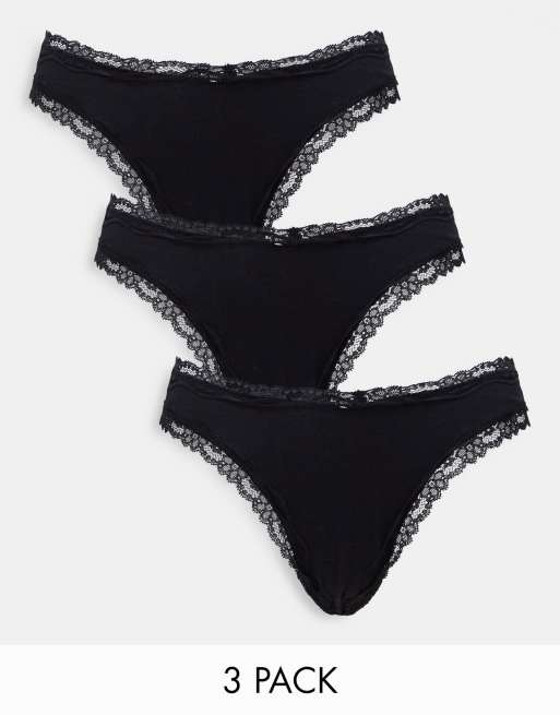 ASOS DESIGN 3-pack cotton & lace trim high rise Malibu lingerie thongs in black