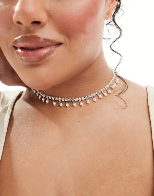 ASOS DESIGN Curve choker necklace with crystal cupchain and faux pearl design in silver tone
