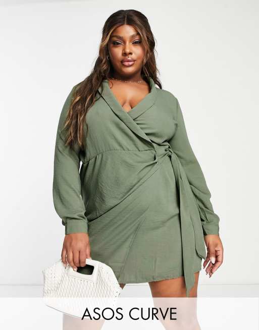 ASOS DESIGN Curve collared wrap mini dress in khaki