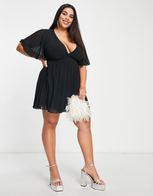 ASOS DESIGN Curve exclusive mini dress with kimono sleeve and tie waist in pleat in Black