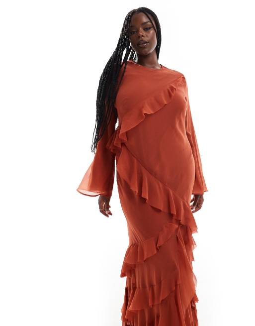 ASOS DESIGN Curve fluted long sleeve extreme ruffle maxi dress in rust