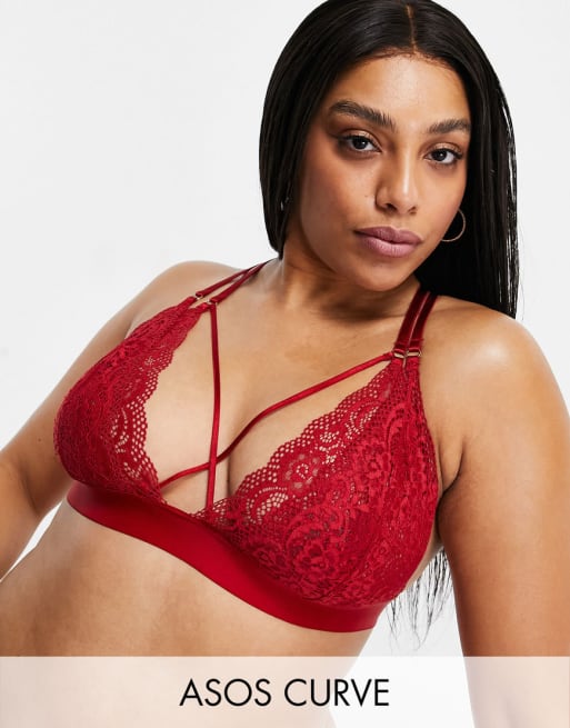 ASOS DESIGN Curve lace strapping soft bra and lingerie thong in deep red