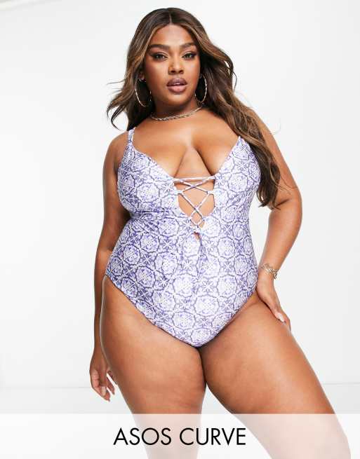 ASOS DESIGN Curve lace up front swimsuit in blue tile print