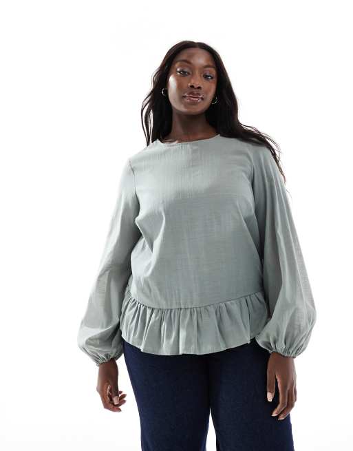 ASOS DESIGN Curve long sleeve peplum hem top in green
