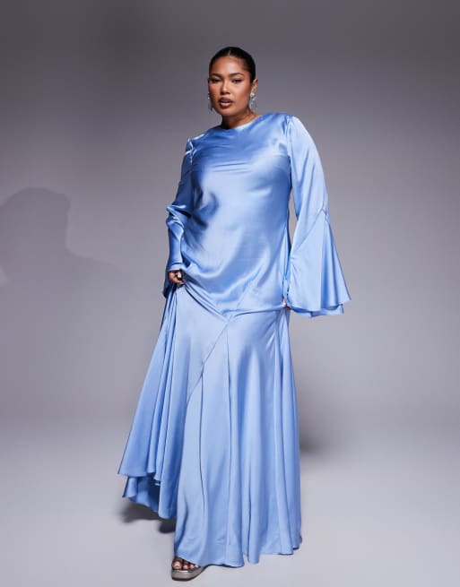 ASOS DESIGN Curve long sleeve satin maxi dress with full skirt and godet in soft blue