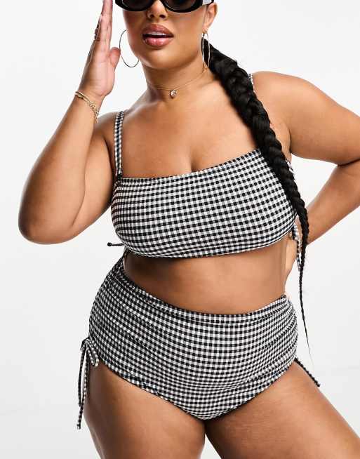 ASOS DESIGN Curve mix and match seersucker ruched side bandeau bikini top in mono gingham