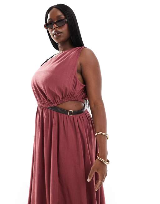 ASOS DESIGN Curve one shoulder textured midi dress with PU trim detail in burgundy