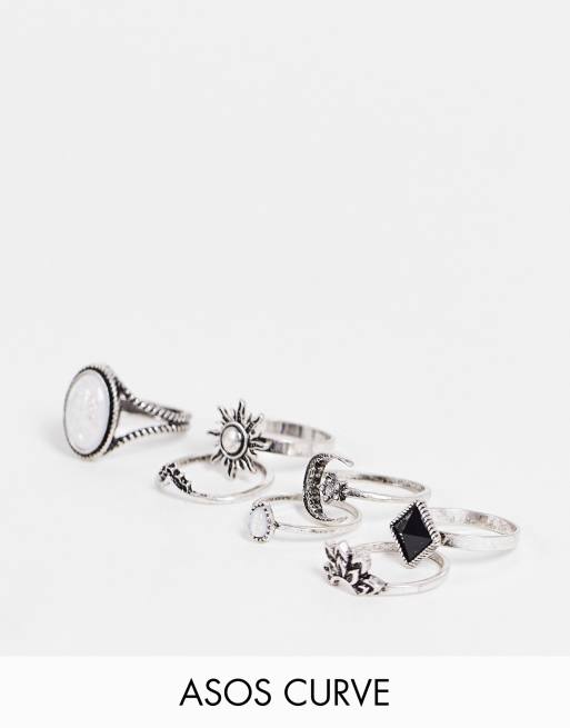 ASOS DESIGN Curve pack of 7 rings in mixed 90s designs in silver tone