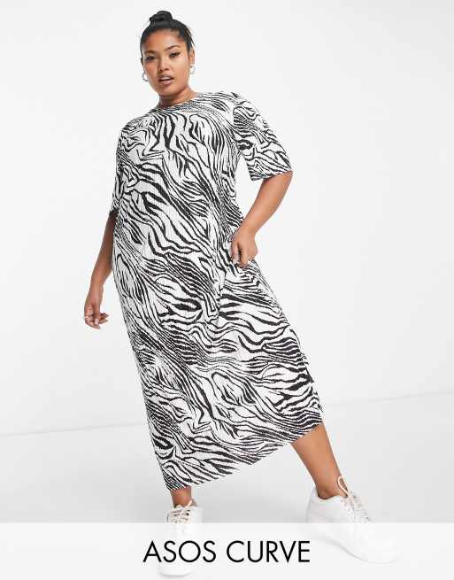 ASOS DESIGN Curve plisse t-shirt midi dress in mono zebra print