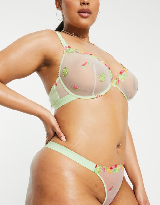 ASOS DESIGN Curve premium tutti fruity embroidered underwired bra and briefs in green