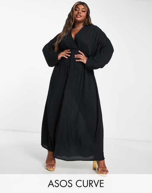ASOS DESIGN Curve ruched long sleeve plunge beach maxi dress in black