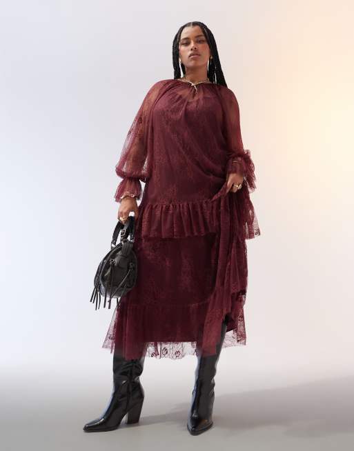 ASOS DESIGN Curve ruffle detail lace maxi dress in burgundy