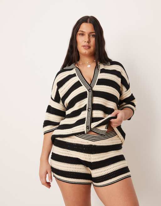 ASOS DESIGN Curve Sally beach knit button-through top in mono stripe (Part of a set)