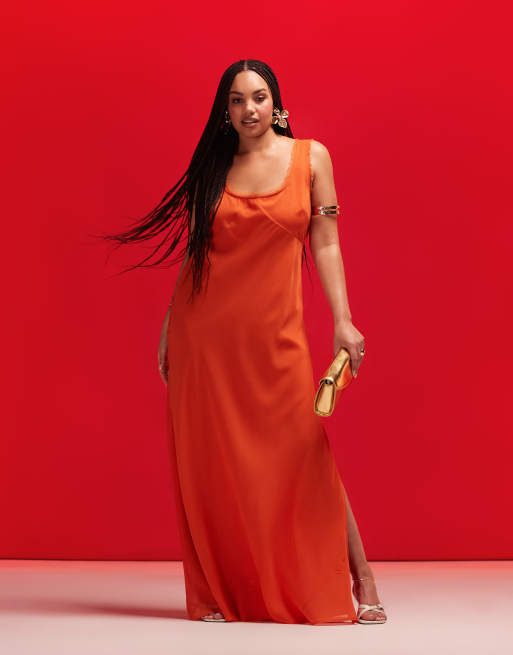 ASOS DESIGN Curve scoop neck raw edge bias maxi dress in burnt orange