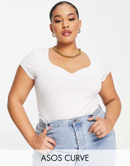 ASOS DESIGN Curve short sleeve t-shirt bodysuit with sweetheart neckline in white
