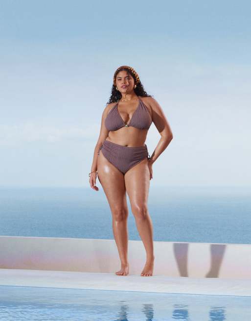 ASOS DESIGN Curve Tayla high-leg high-waist bikini bottom with gold bead trim in brown