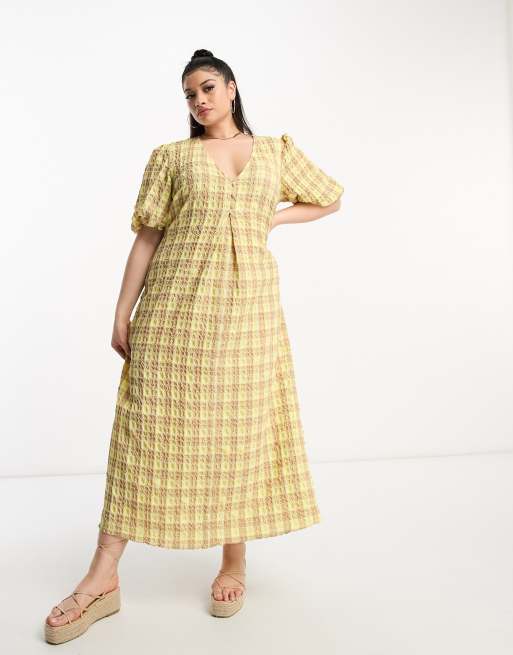 ASOS DESIGN Curve textured midi tea dress in yellow check
