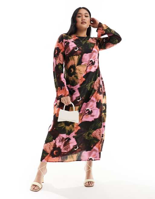 ASOS DESIGN Curve viscose slash neck midi dress with v-back detail in large black floral print