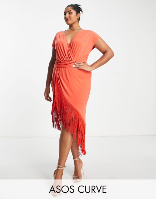ASOS DESIGN Curve wrap midi dress with fringing detail in burnt orange
