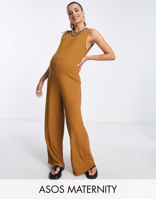 ASOS DESIGN Maternity rib sleeveless smock jumpsuit in tobacco