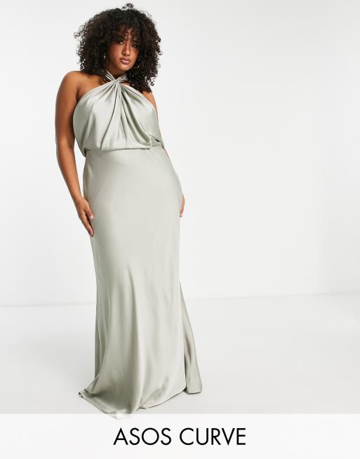 ASOS EDITION Curve satin ruched halterneck maxi dress in sage green