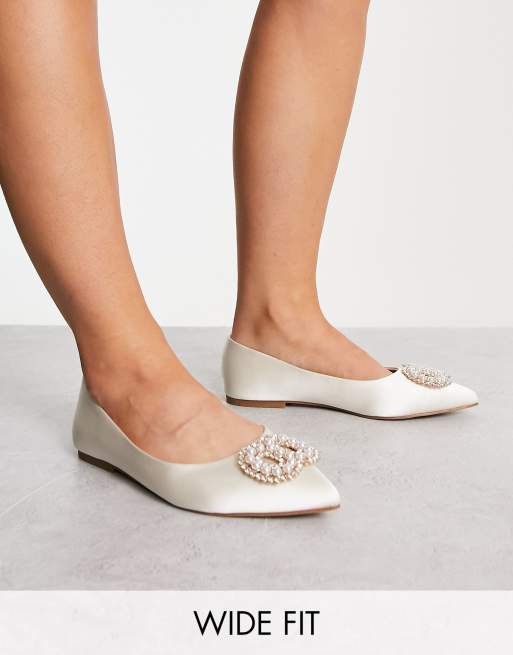 ASOS DESIGN Wide Fit Lola faux pearl embellished pointed ballet flats in ivory satin