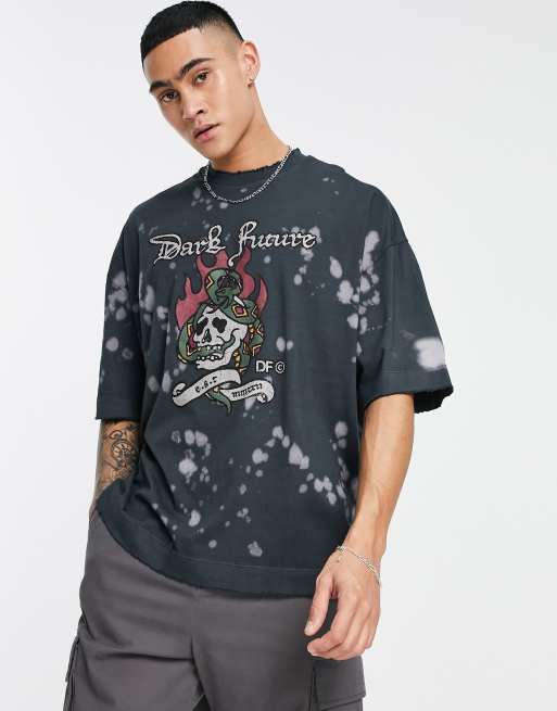 ASOS Dark Future oversized t-shirt with raw edges and acid wash graphic prints in black