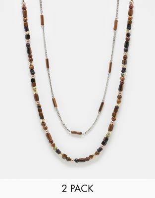 ASOS DESIGN 2 pack beaded necklace in brown tone
