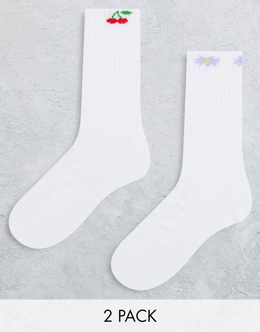 ASOS DESIGN 2 pack calf length rib socks with welt design in white