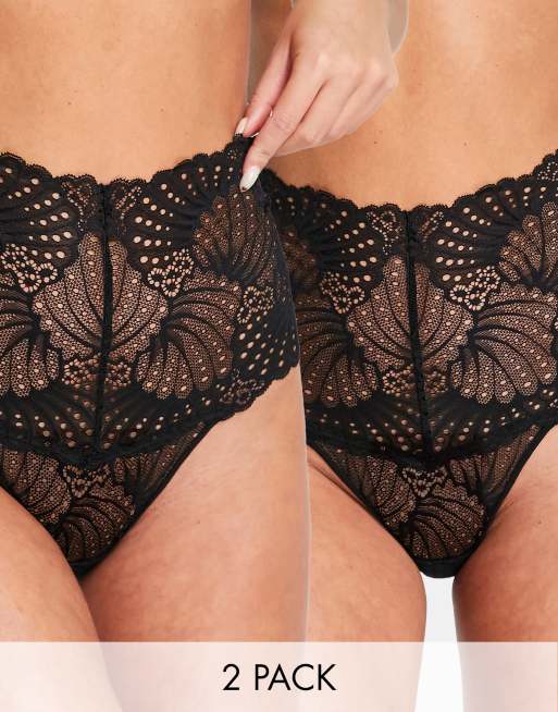 ASOS DESIGN 2 pack deep waist lace thong pack in black