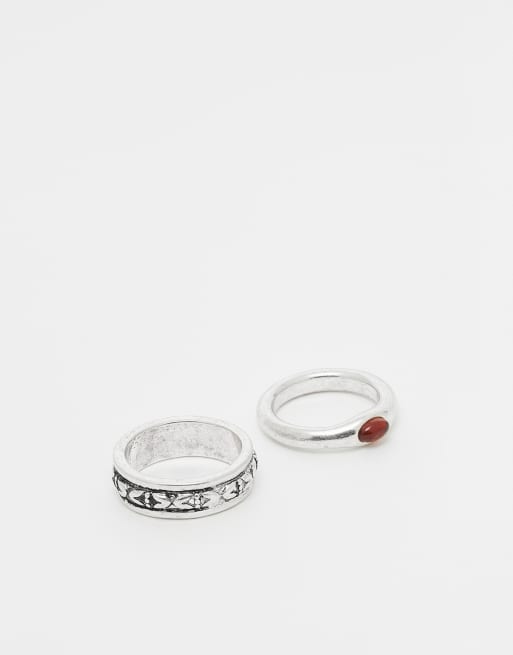 ASOS DESIGN 2 pack of rings with patterned texture and red stone rings in burnished silver