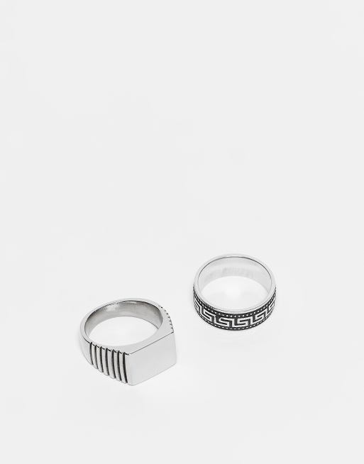 ASOS DESIGN 2 pack of waterproof stainless steel Greek wave slim signet and band ring in silver tone