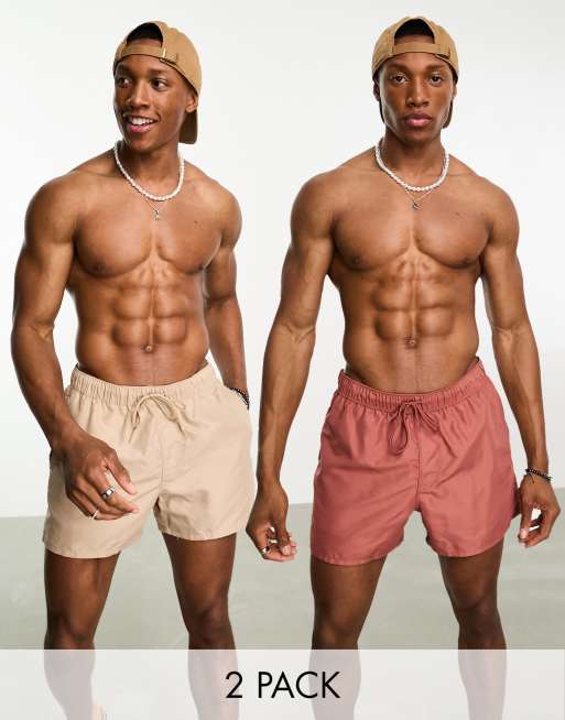 ASOS DESIGN 2 pack swim shorts in short length beige/brown