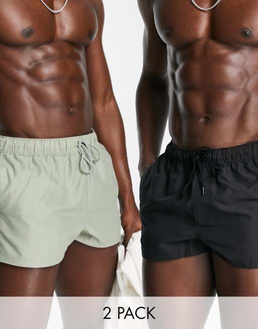 ASOS DESIGN 2 pack swim shorts in super short length in green/black