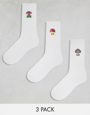 ASOS DESIGN 3 pack socks with mushroom embroidery in white