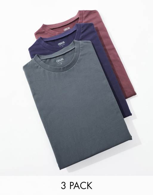 ASOS DESIGN 3 pack t-shirt with crew neck in navy, brown and grey