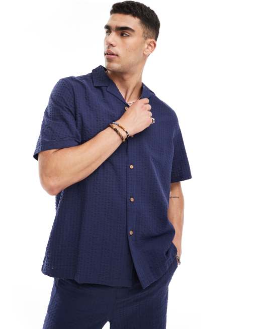 ASOS DESIGN 90s oversized short sleeve shirt in seersucker texture in navy (part of a set)