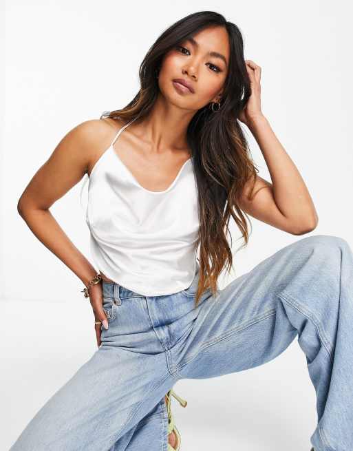 ASOS DESIGN 90s satin scarf double tie halter top in ivory