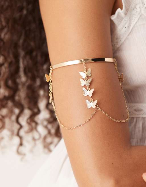 ASOS DESIGN arm cuff with butterfly waterfall chains in gold tone