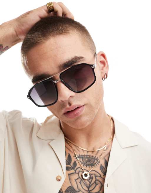 ASOS DESIGN aviator sunglasses with silver chain detail in black gradient
