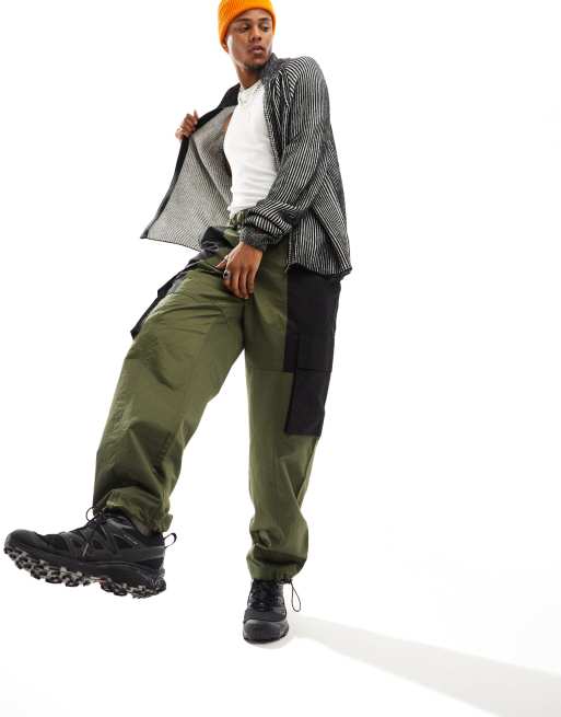 ASOS DESIGN baggy cargo pants in khaki and black colour blocking with belt detail in nylon