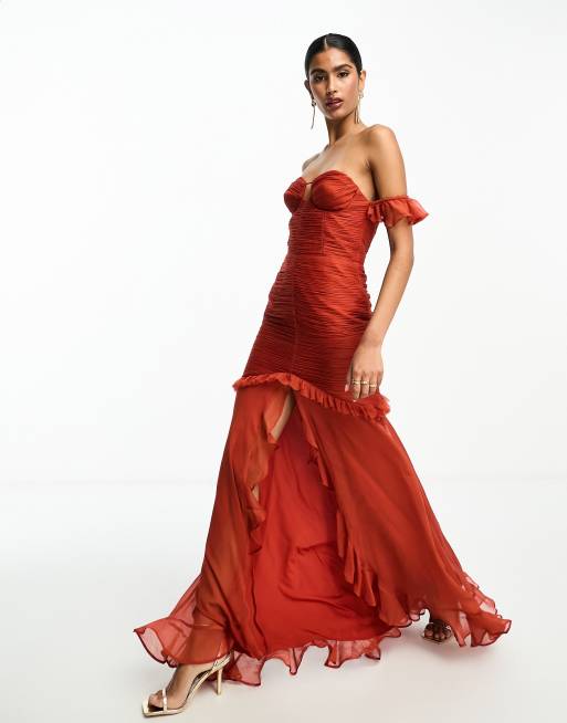 ASOS DESIGN bardot ruched detail high low maxi dress in rust