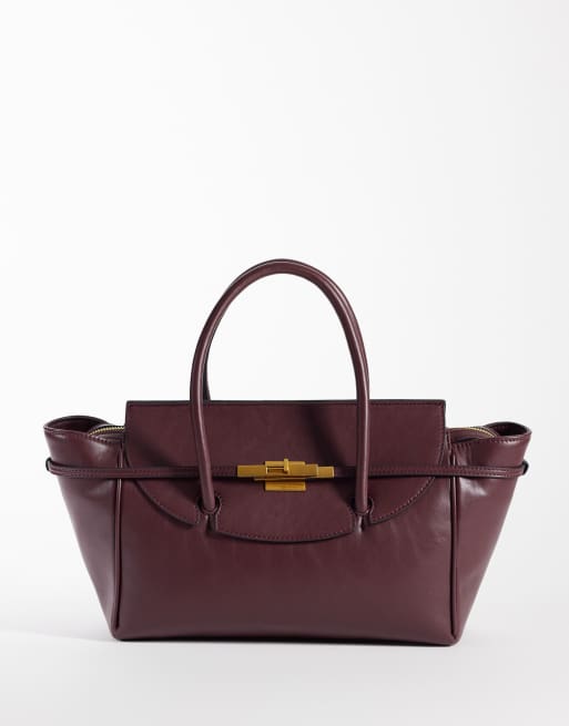 ASOS DESIGN belted hardware grab handle tote bag in burgundy